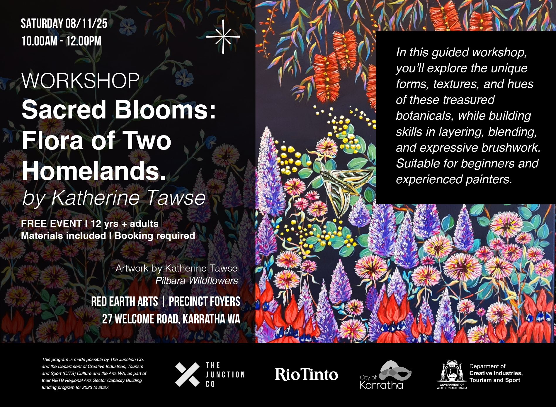Acknowledgements: The Red Earth Arts Precinct Exhibition Program is managed by The Junction Co. on behalf of the City of Karratha. This program is made possible through the generous sponsorship of Rio Tinto and the support of the Department of Local Government, Sport and Cultural Industries (DLGSC) Culture and the Arts WA, as part of their RETB Regional Arts Sector Capacity Building funding program for 2023 to 2027.